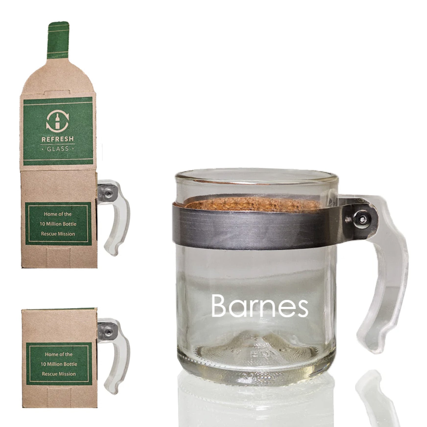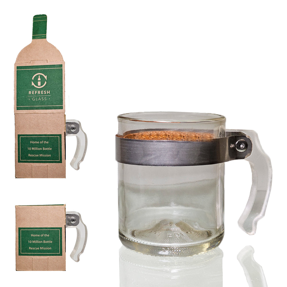 These coffee mugs look and feel great! The glass is from our 10 million bottle rescue mission and the bamboo handles are CNC cut and rounded in house. The strap is a food safe stainless steel and a rivet holds the handle on securely.