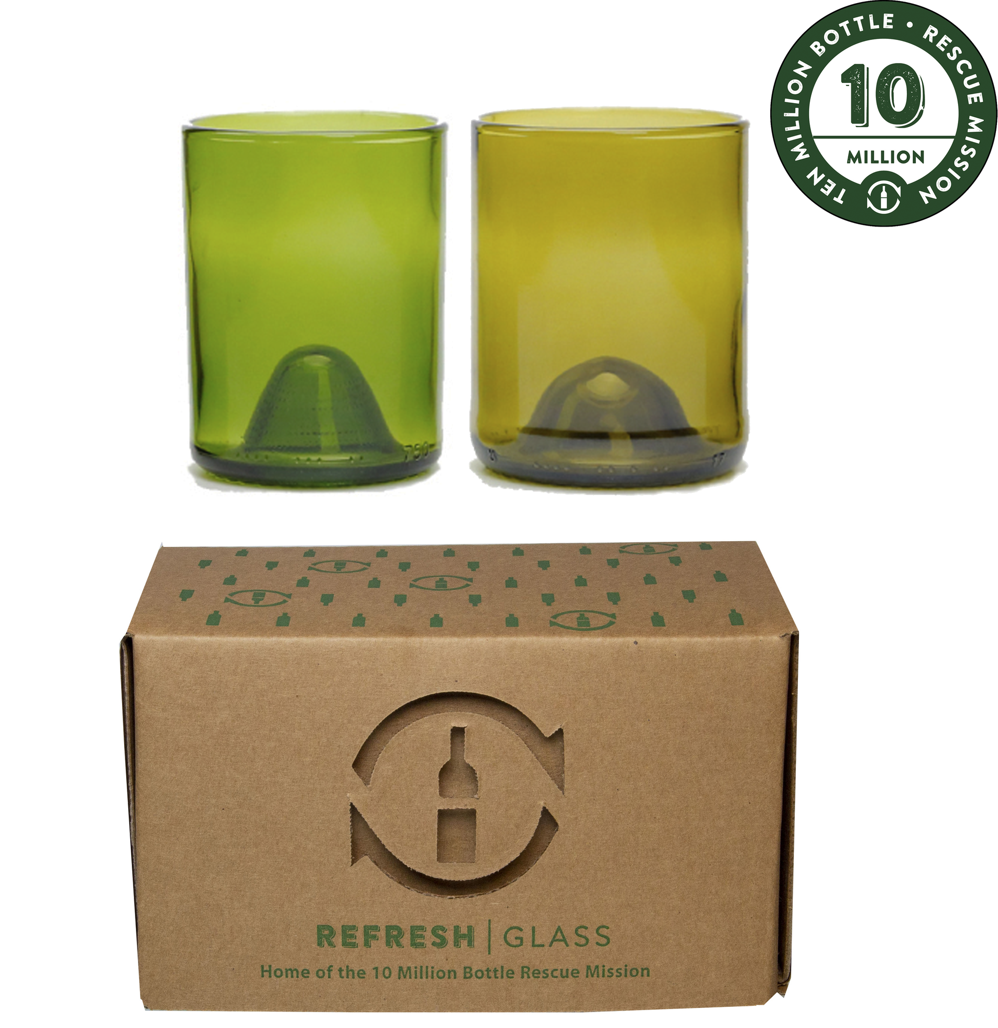 Refresh Glasses are shipped in custom packaging that shows our story, in sets of 4. Each glass is created from a wine bottle that we collected from local bars and restaurants, working towards our 10 Million Bottle Rescue Mission. During our process the glasses are melted to create a smooth, even, rounded rim. The final step of our process stress relieves the glass so they are dishwasher safe and you can continue to enjoy using the glasses for years to come. Don't be fooled by others who purchase bottles from the factory or wineries overstock (without helping the environment) or have rough and sharper sanded rims. We pride ourselves on our rescue mission and quality.