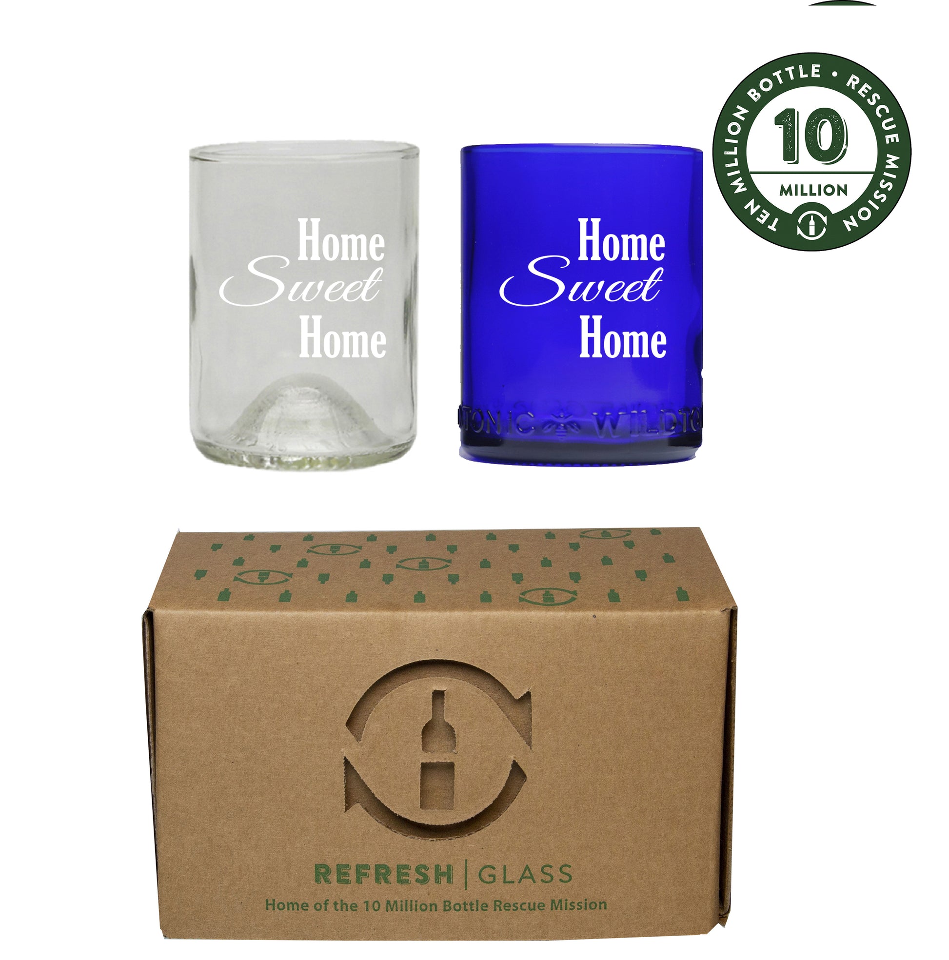 Refresh Glasses are shipped in custom packaging that shows our story, in sets of 4. Each glass is created from a wine bottle that we collected from local bars and restaurants, working towards our 10 Million Bottle Rescue Mission. During our process the glasses are melted to create a smooth, even, rounded rim. The final step of our process stress relieves the glass so they are dishwasher safe and you can continue to enjoy using the glasses for years to come. Don't be fooled by others who purchase bottles from the factory or wineries overstock (without helping the environment) or have rough and sharper sanded rims. We pride ourselves on our rescue mission and quality.