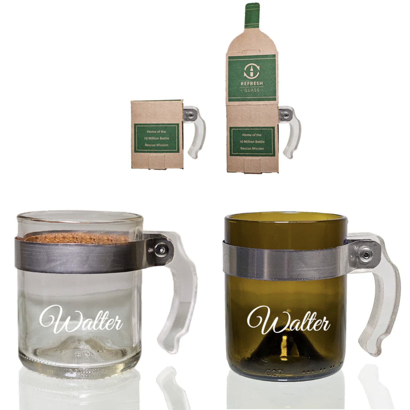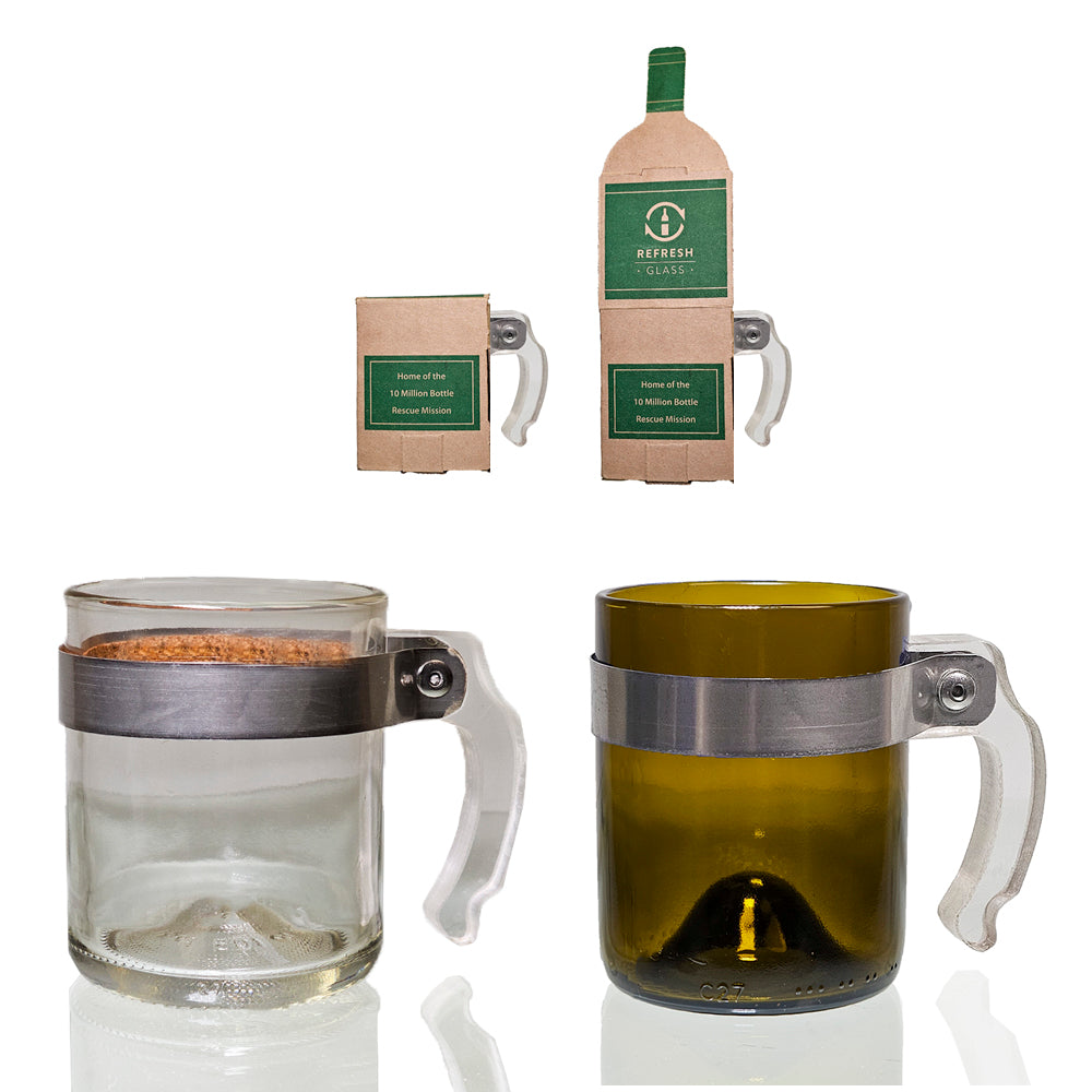 These coffee mugs look and feel great! The glass is from our 10 million bottle rescue mission and the acrylic handles are CNC cut and rounded in house. The strap is a food safe stainless steel and a rivet holds the handle on securely.