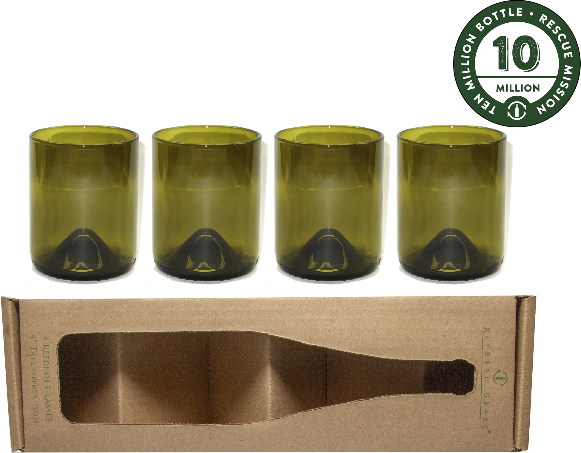 Refresh Glasses are shipped in custom packaging that shows our story, in sets of 4. Each glass is created from a wine bottle that we collected from local bars and restaurants, working towards our 10 Million Bottle Rescue Mission. During our process the glasses are melted to create a smooth, even, rounded rim. The final step of our process stress relieves the glass so they are dishwasher safe and you can continue to enjoy using the glasses for years to come. Don't be fooled by others who purchase bottles from the factory or wineries overstock (without helping the environment) or have rough and sharper sanded rims. We pride ourselves on our rescue mission and quality.