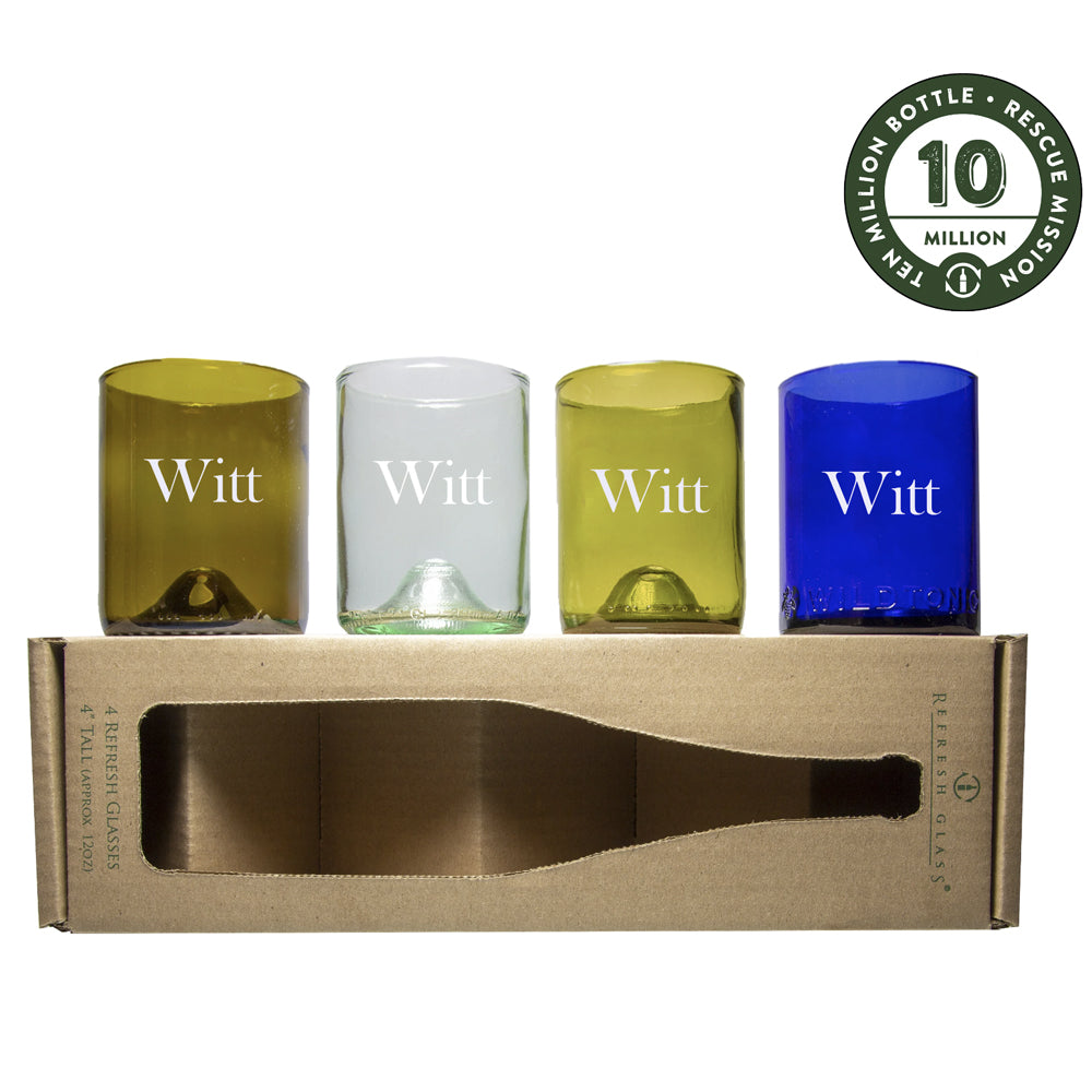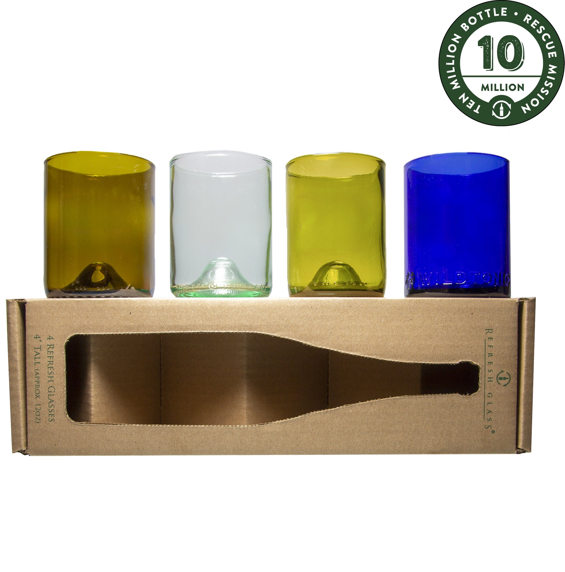 Refresh Glasses are shipped in custom packaging that shows our story, in sets of 4. Each glass is created from a wine bottle that we collected from local bars and restaurants, working towards our 10 Million Bottle Rescue Mission. During our process the glasses are melted to create a smooth, even, rounded rim. The final step of our process stress relieves the glass so they are dishwasher safe and you can continue to enjoy using the glasses for years to come. Don't be fooled by others who purchase bottles from the factory or wineries overstock (without helping the environment) or have rough and sharper sanded rims. We pride ourselves on our rescue mission and quality.