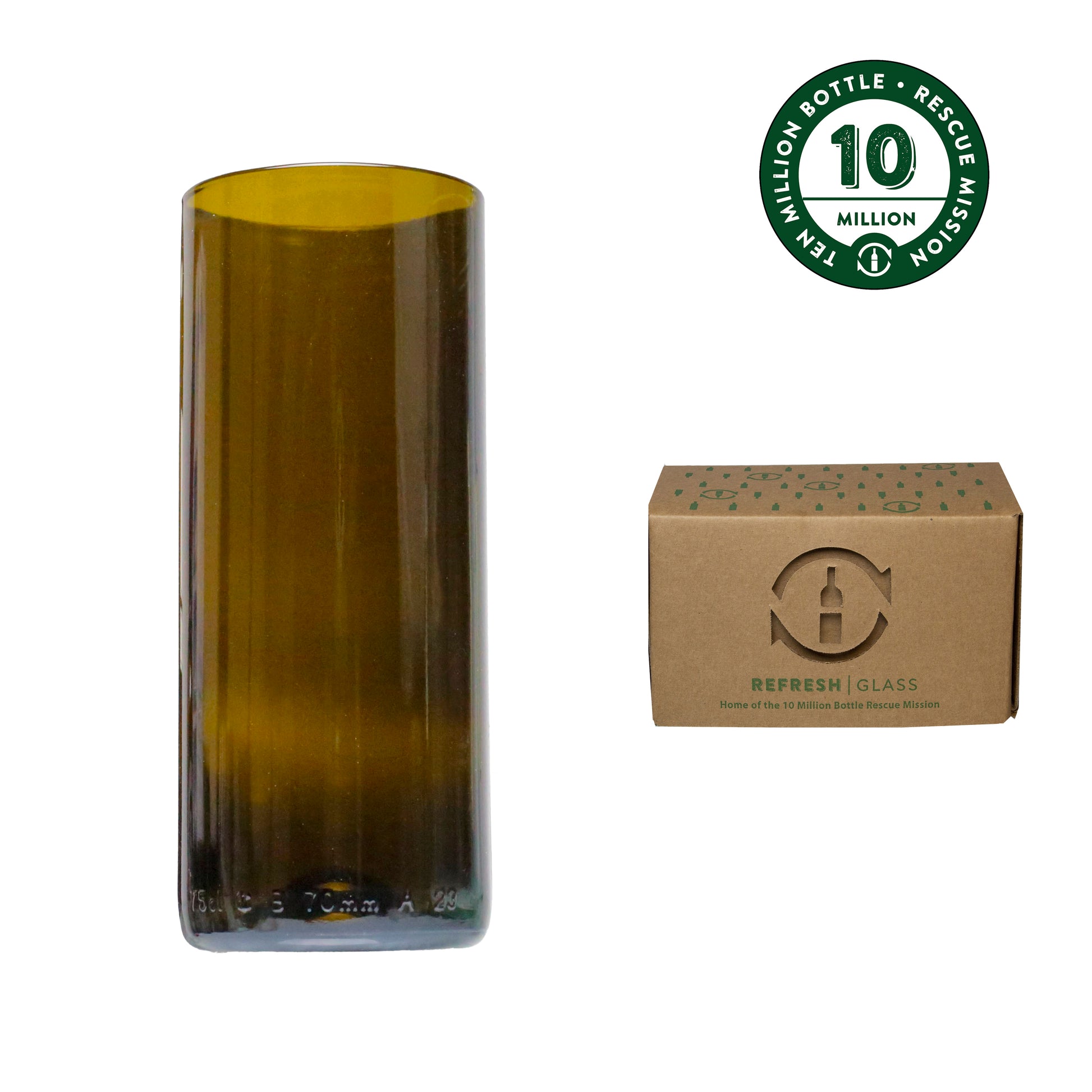 Refresh Glasses are shipped in custom packaging that shows our story, in sets of 4. Each glass is created from a wine bottle that we collected from local bars and restaurants, working towards our 10 Million Bottle Rescue Mission. During our process the glasses are melted to create a smooth, even, rounded rim. The final step of our process stress relieves the glass so they are dishwasher safe and you can continue to enjoy using the glasses for years to come. Don't be fooled by others who purchase bottles from the factory or wineries overstock (without helping the environment) or have rough and sharper sanded rims. We pride ourselves on our rescue mission and quality.
